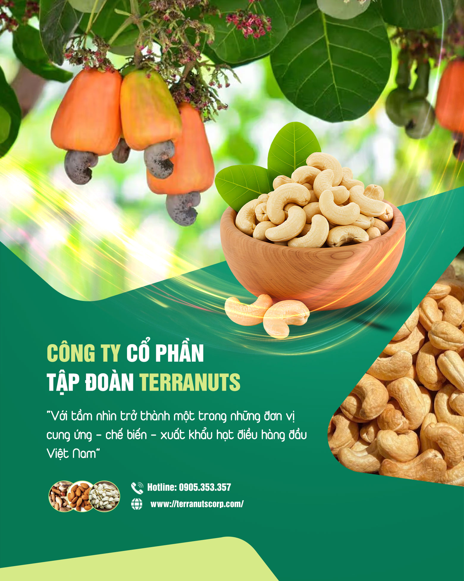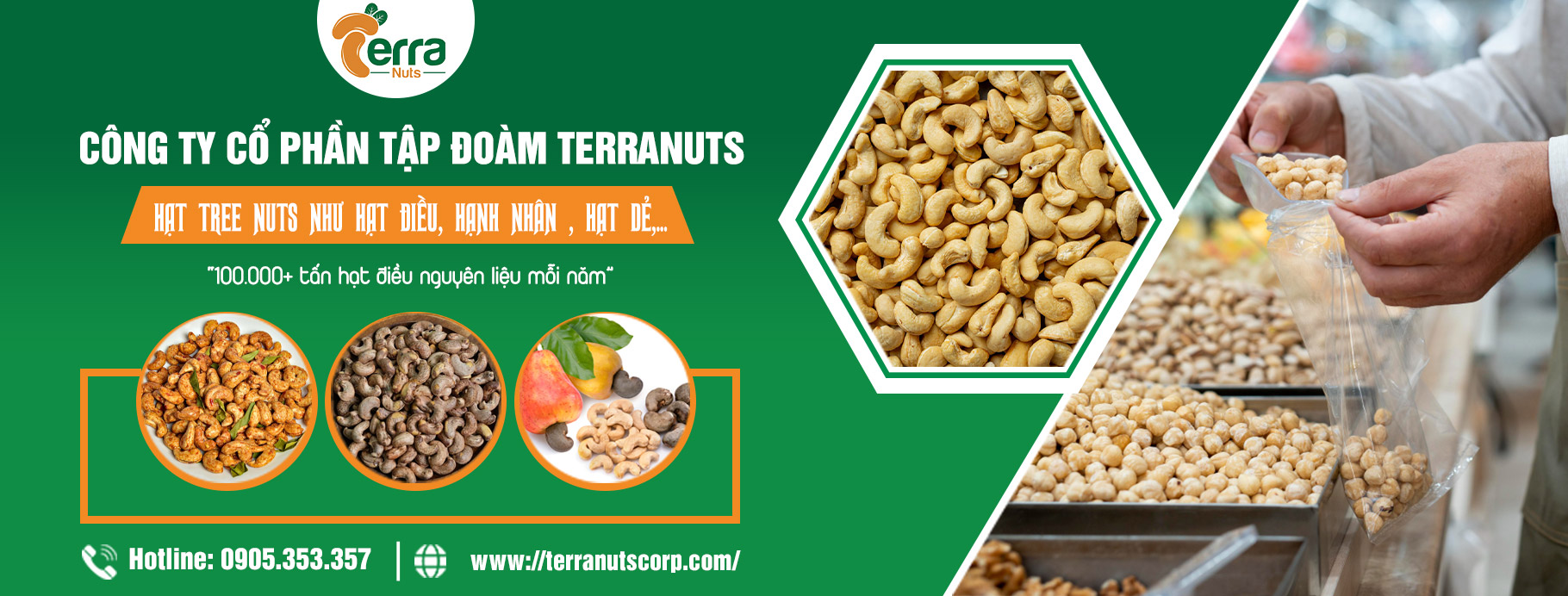 Công ty Cổ Phần Tập Đoàn TerraNuts được thành lập với khát vọng xây dựng thương hiệu hạt dinh dưỡng mang tầm quốc tế, đại diện cho chất lượng và uy tín của nông sản Việt Nam. Dù còn trẻ, TerraNuts sở hữu chiến lược phát triển rõ ràng, cùng định hướng đầu tư mạnh vào công nghệ chế biến hiện đại, hệ thống nhà máy chuẩn quốc tế và chuỗi cung ứng nguyên liệu từ Việt Nam đến Campuchia và nhiều quốc gia châu Phi. Chúng tôi tập trung vào các sản phẩm Tree Nuts, đặc biệt là Hạt Điều, với mục tiêu đạt doanh số từ vài trăm đến hàng nghìn tỷ đồng mỗi năm. TerraNuts cam kết mang đến sản phẩm chất lượng cao, truy xuất minh bạch, đáp ứng tiêu chuẩn nghiêm ngặt của EU, Mỹ, Trung Đông và châu Á. Với định hướng xây dựng chuỗi sản xuất – chế biến – xuất khẩu hoàn chỉnh và tư duy phát triển toàn cầu, TerraNuts tự tin đồng hành cùng đối tác, tạo dựng giá trị bền vững và khẳng định vị thế của một doanh nghiệp nông sản thế hệ mới.